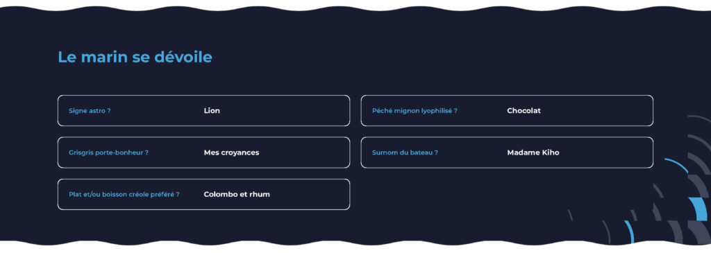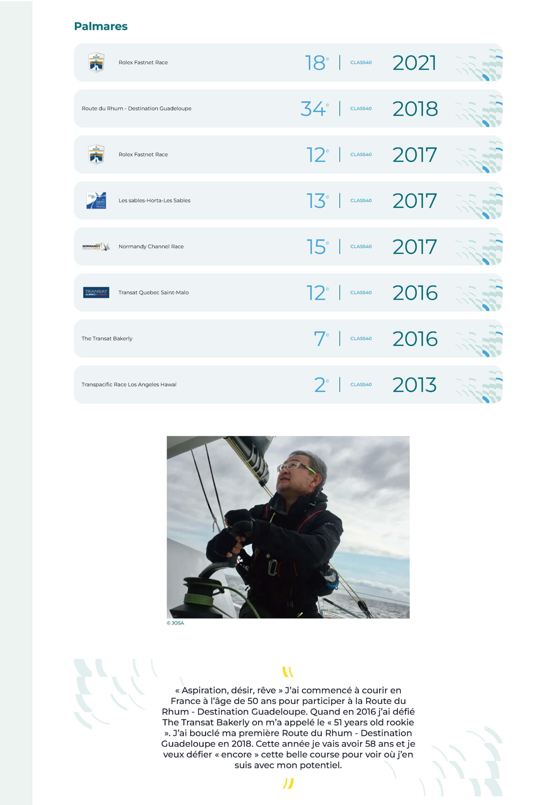 「憧れ、願望、夢」50歳でRoute du Rhum-Destination Guadeloupに出場するためフランスでのセーリングを始めた。2016年にThe Transatに挑戦したときには「51歳のルーキー」と呼ばれた。2018年に初めてのRoute du Rhum-Destination Guadeloup を完走。今年は58歳になる、自分の可能性を確認するために「再び」この美しいレースに挑戦したい!
